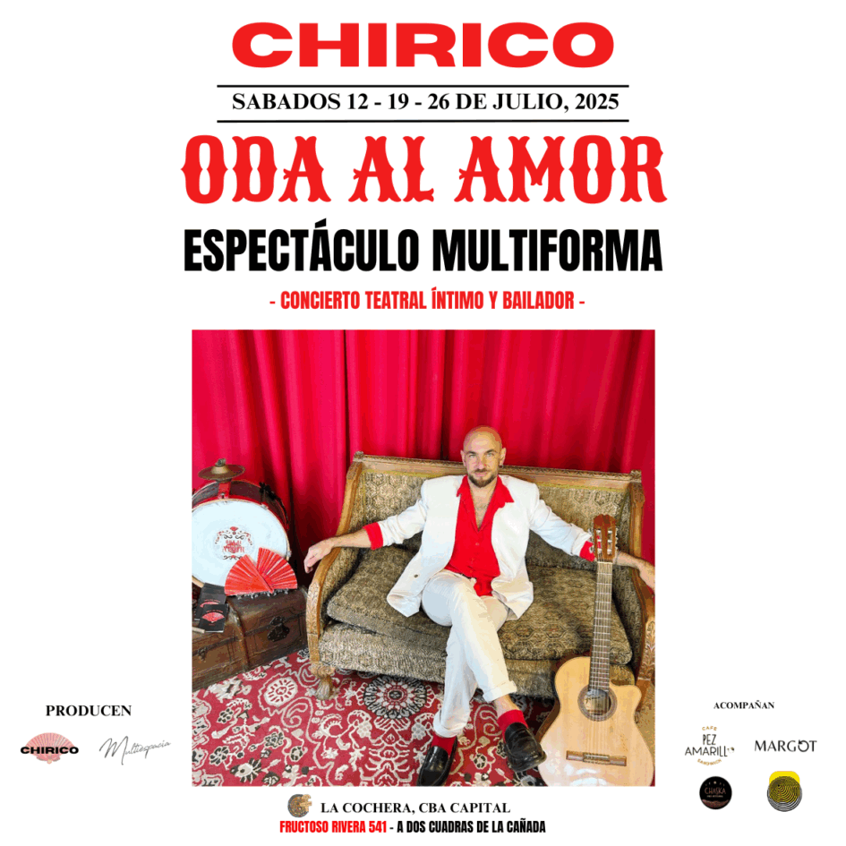Desde el sábado 12 de julio -y por el resto del mes- estará en cartelera una propuesta única que combina diversos lenguajes artísticos en escena: “Oda al Amor”. Definida como un espectáculo multiforma, éste concierto teatral, íntimo y bailador es el resultado de la interdisciplinariedad de su autor y artista principal Chirico, músico y cancionista porteño radicado en Unquillo.