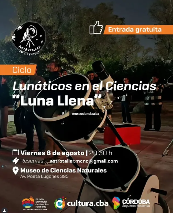 Viernes 8 de agosto a las 20:30 en el Museo de Ciencias Naturales. Entrada gratuita (con reserva previa) Te invitamos a vivir una noche mágica de observación astronómica. Bajo el resplandor de la Luna Llena, vamos a explorar su geografía con nuestro telescopio Newtoniano de 300 mm y conocer más sobre su vínculo con la Tierra.