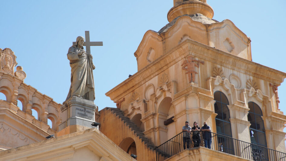 Desde las alturas, se puede apreciar el estilo arquitectónico de la iglesia y sus hermosos detalles, como la cúpula, contrafuertes y los ángeles nativos de las torres.