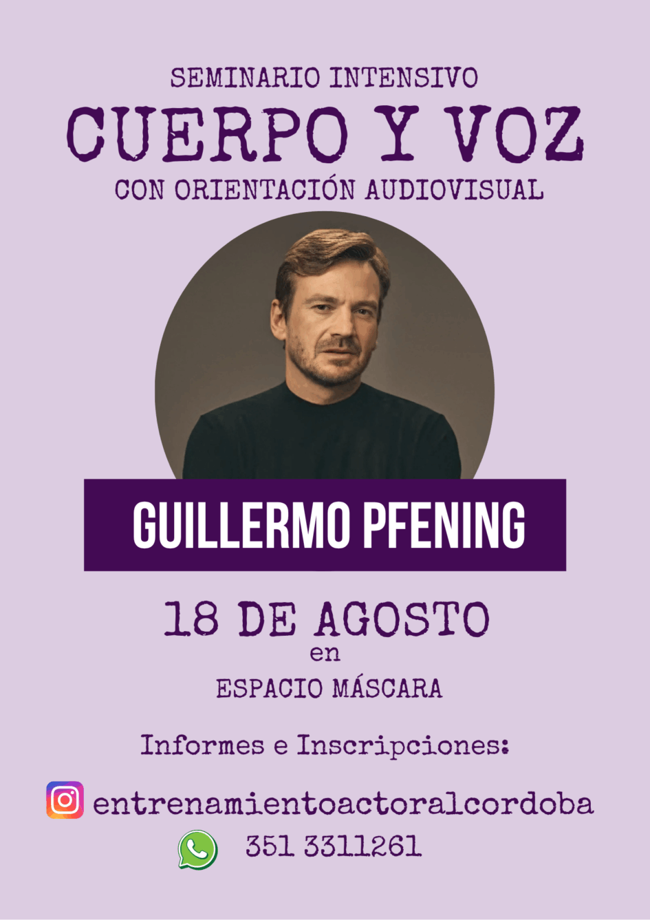 El reconocido actor y director Guillermo Pfening llega a Córdoba para ofrecer un seminario intensivo de actuación organizado y producido por Entrenamiento Actoral Córdoba.La cita será el lunes 18 de agosto, de 16 a 22 hs, en Espacio Máscara (Santa Fe 920, Córdoba Capital).