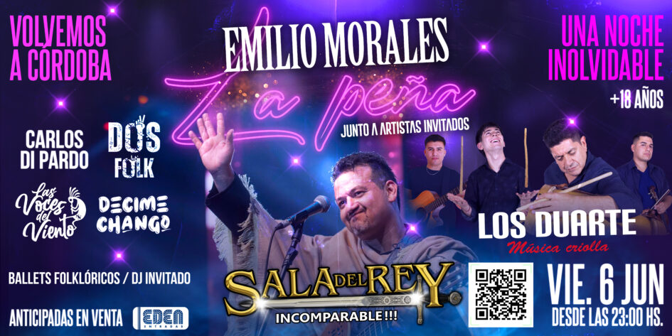 El cantautor catamarqueño Emilio Morales llega a Córdoba con su peña en la que promete una noche de grandes canciones, baile y muchos artistas en escena. La cita será el viernes 6 de junio desde las 23 hs. en Sala del Rey, Humberto 1º 439; Córdoba. El evento, contará con la actuación principal de Emilio Morales y su banda quien se presentará junto a Los Duarte, Dos Folk, Decime Chango, Las Voces del Viento, Carlos Di Pardo. Además, la propuesta se completa con la participación especial de distintos ballets folklóricos, DJ e invitados especiales. Las entradas tienen un valor de $ 7000 más cargo de servicio y pueden conseguirse de manera anticipada a través del sistema Edén Entradas.