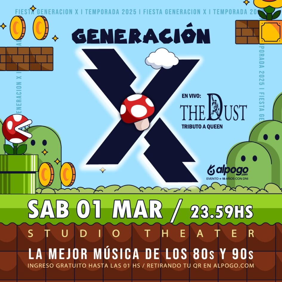 La fiesta “Generación X” estará desarrollándose este sábado 1 de marzo desde la hora 23.59, la cita será en Studio Theater, ubicado en Rosario de Santa Fe 272 en pleno centro de la ciudad de Córdoba. Además, contará con la participación en vivo de la banda The Dust (tributo a Queen) interpretando lo mejor de la banda Queen.