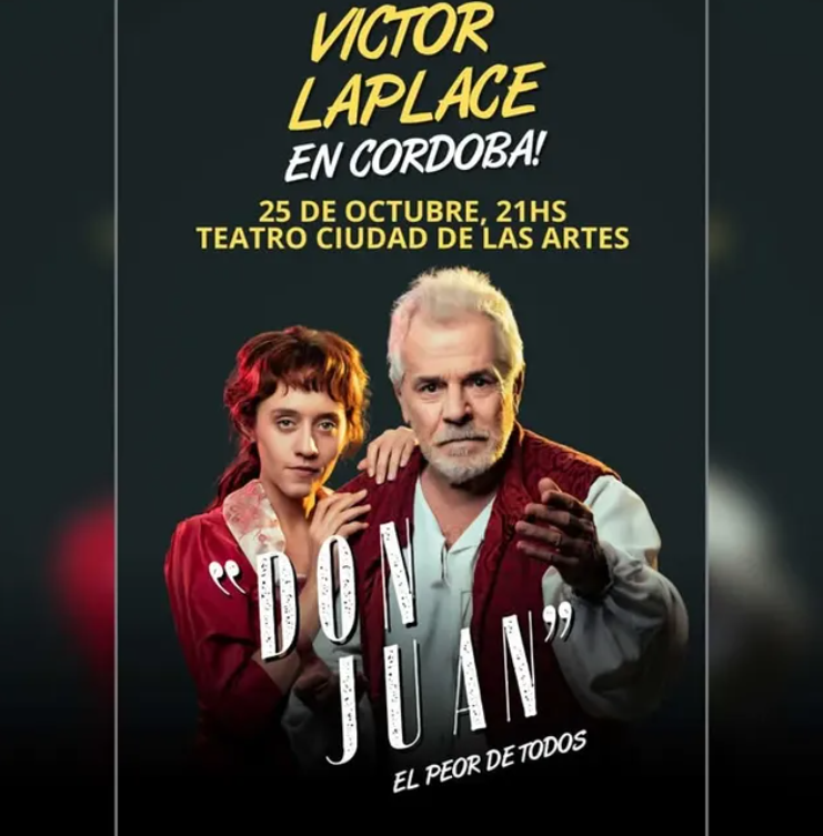 El prestigioso actor VICTOR LAPLACE regresa a Córdoba!… esta vez con DON JUAN, EL PEOR DE TODOS, su nuevo espectáculo que ya es sucedo en la calle Corrientes. En DON JUAN, Laplace demuestra todo su talento en un texto vibrante y emocionante, acompañado por una de las promesas del teatro nacional como lo es Antonella Fittipaldi.