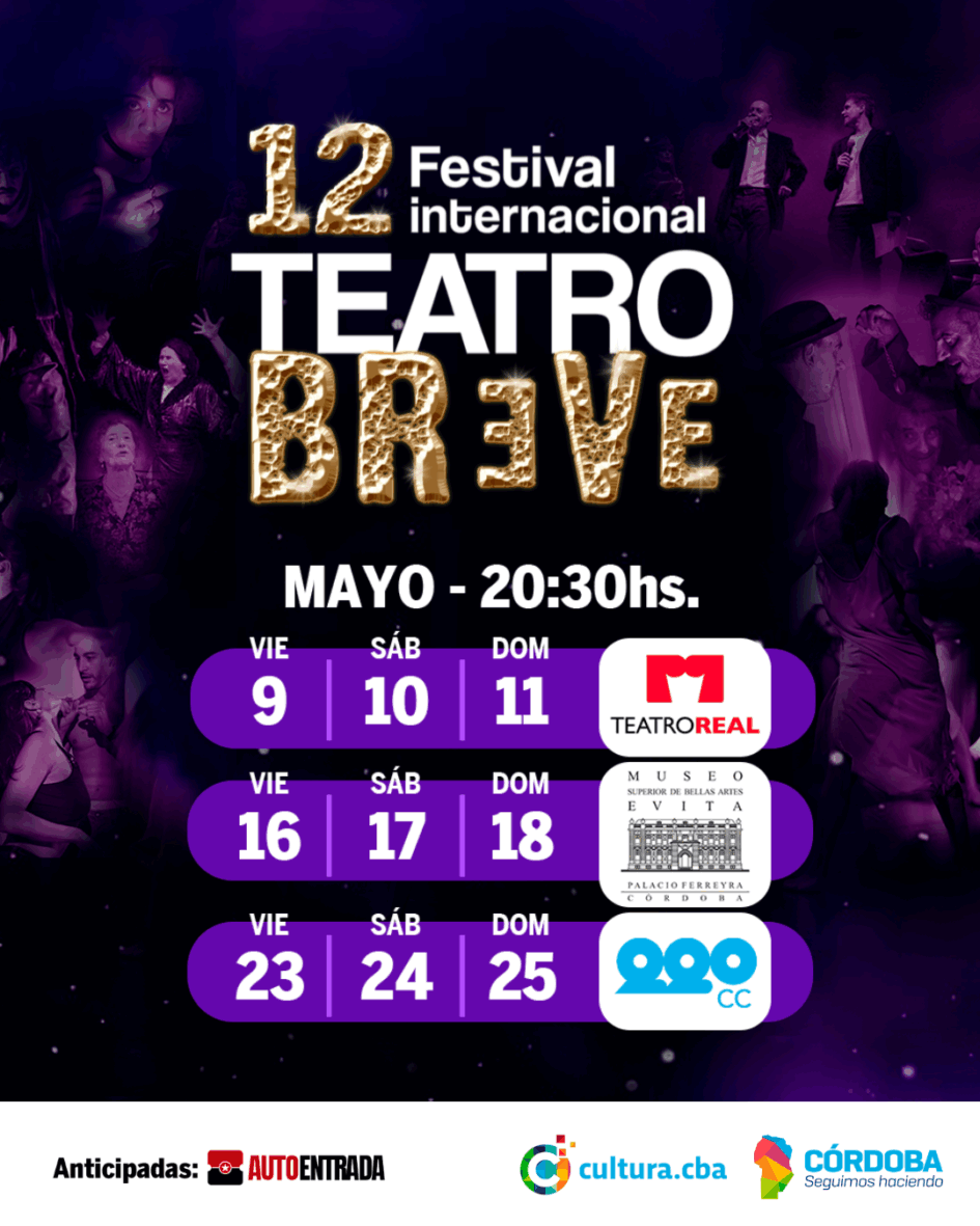 En mayo, tres escenarios icónicos de la ciudad de Córdoba serán sede de una experiencia teatral intensa: llega la 12ª edición del Festival Internacional de Teatro Breve, una celebración de lo breve como forma actual y transformadora de narrar. Se presentan obras de Brasil, Uruguay, España, Buenos Aires, Valle de Paravachasca, Carlos Paz y Córdoba.